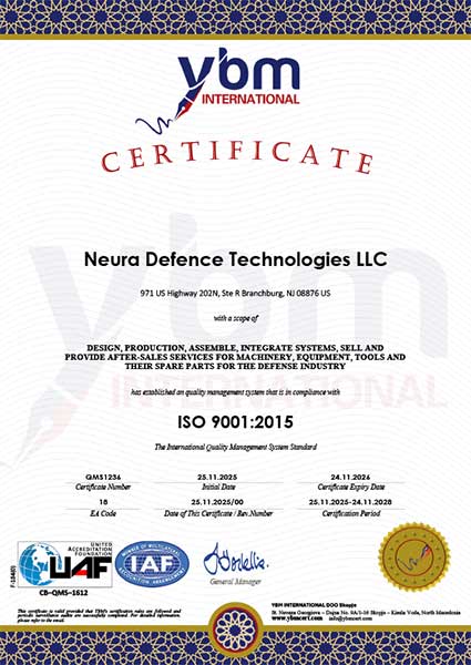 Our dedication to engineering excellence is reinforced by our internationally recognized certifications: ISO 9001:2015 – Quality Management System and AS9100D – Aerospace Quality Management System. These standards guide every stage of our operations—from design and assembly to testing, documentation, and lifecycle support—ensuring reliability, traceability, and consistency across all Neura Defence products.